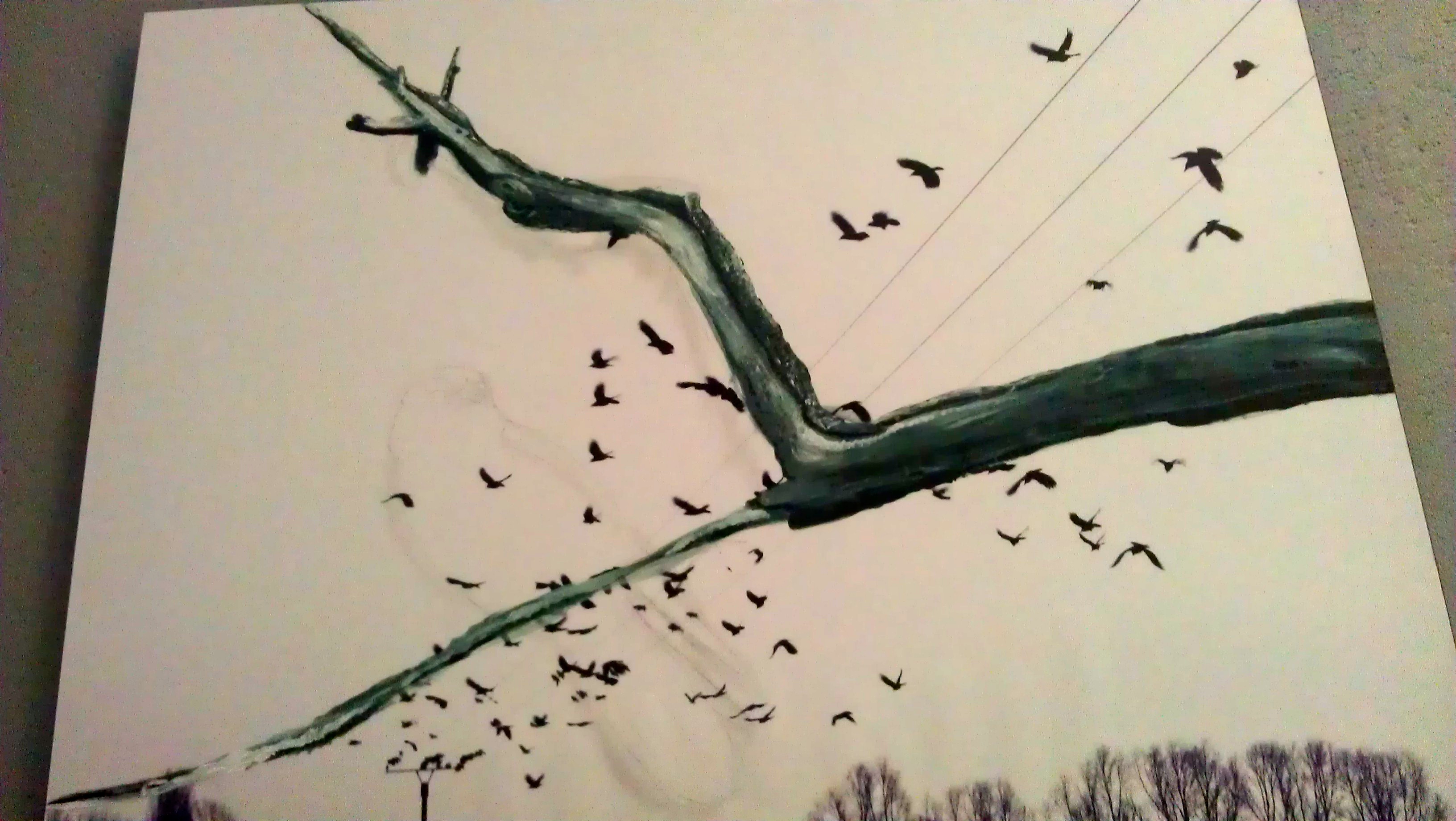 Zuerst habe ich mit Bleistift den Ast und die Krähe skizziert. Dann habe ich mit Acrylfarbe den Ast ausgemalt und die Farbe trocknen lassen (s.o.). Die Nägel habe ich mit einem Hammer vorerst entlang den Umrissen und in die Eckpunkte der Skizze eingehämmert (s.u.). Genauso habe ich im Rumpf des Vogels noch weitere Faden-Führungen eingefügt.