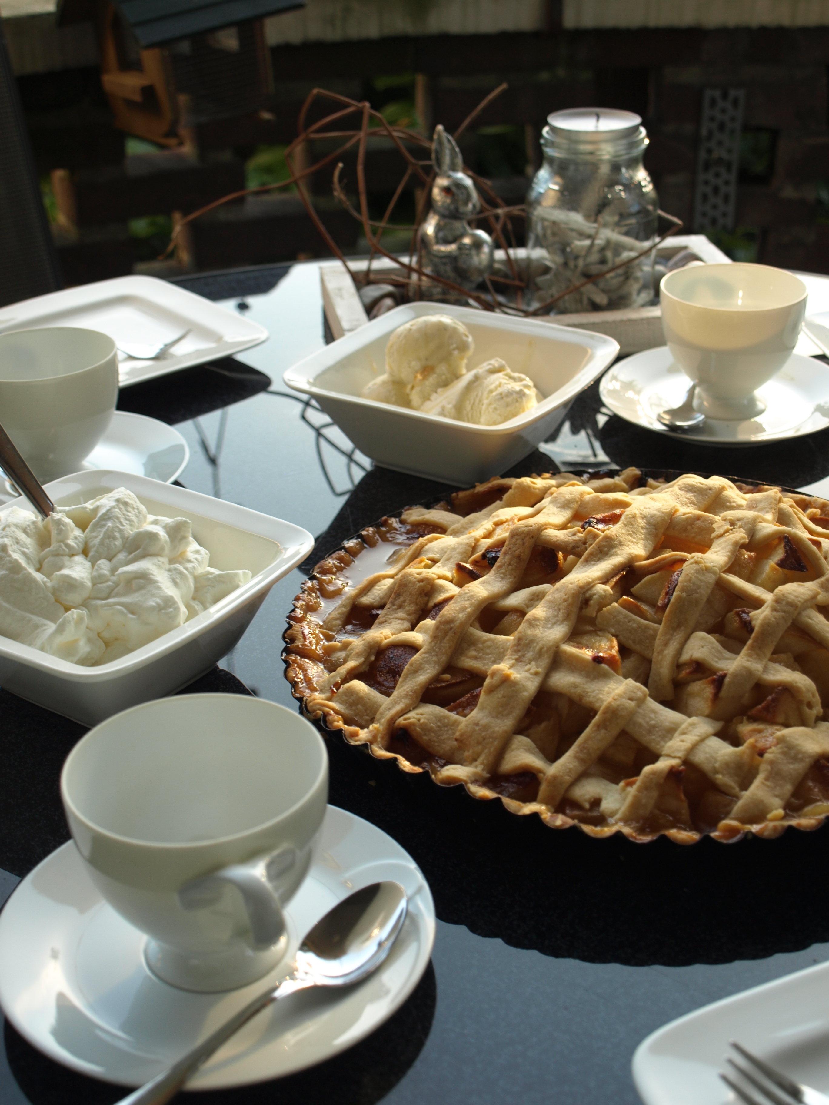 Da wir leider eine zu große Kuchenform genommen haben, mussten wir mit dem Teig ein wenig sparsamer umgehen. Der Boden wurde hauchzart und bei dem Deckel hatten wir echt damit zu kämpfen, genug Gitter auf den Pie legen zu können :D. Der lauwarme Applepie war mit Vanilleeis und Sahne trotzdem einfach super lecker 😉