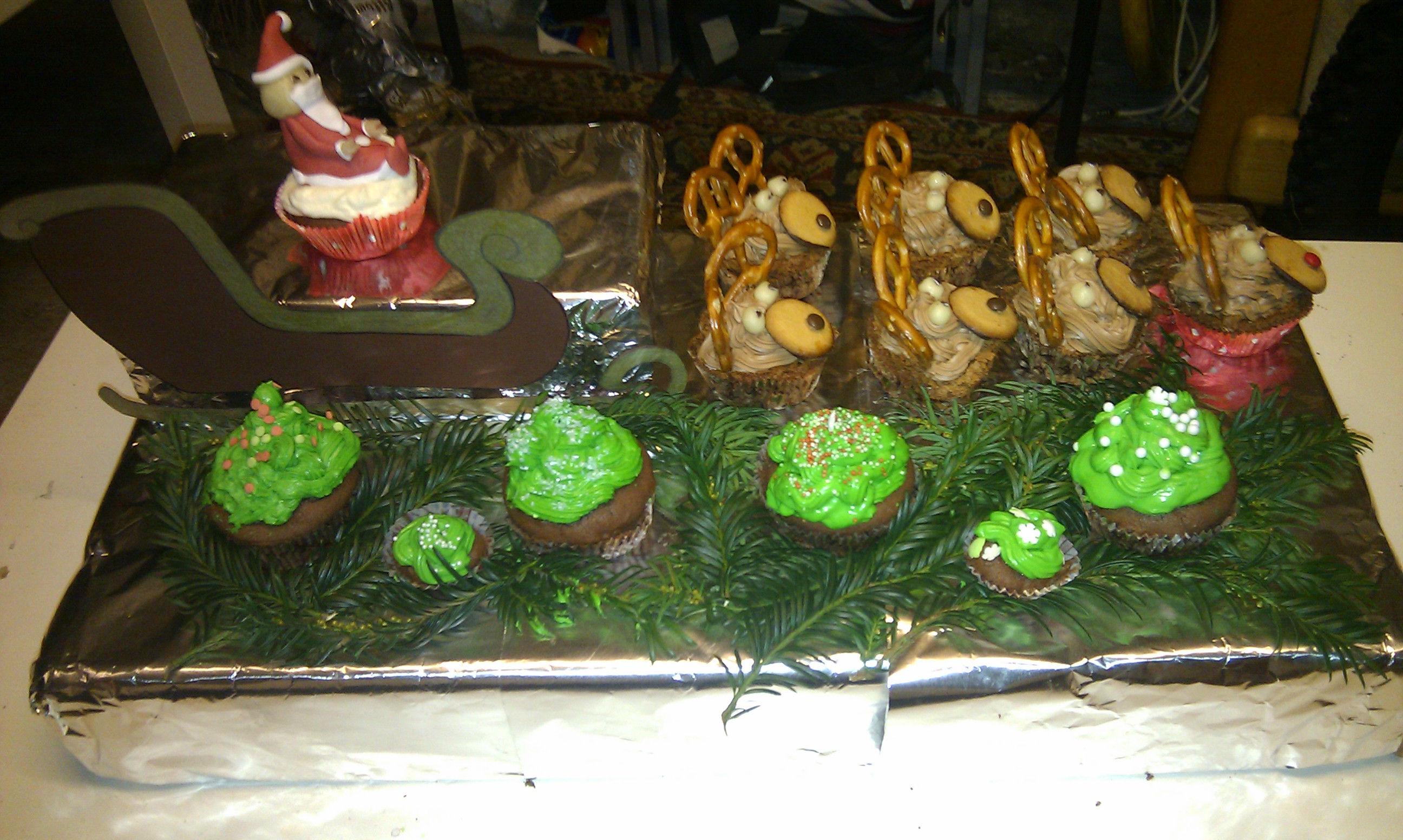Weihnachtsmann mit Rentieren und Tannenbäume – Cupcakes