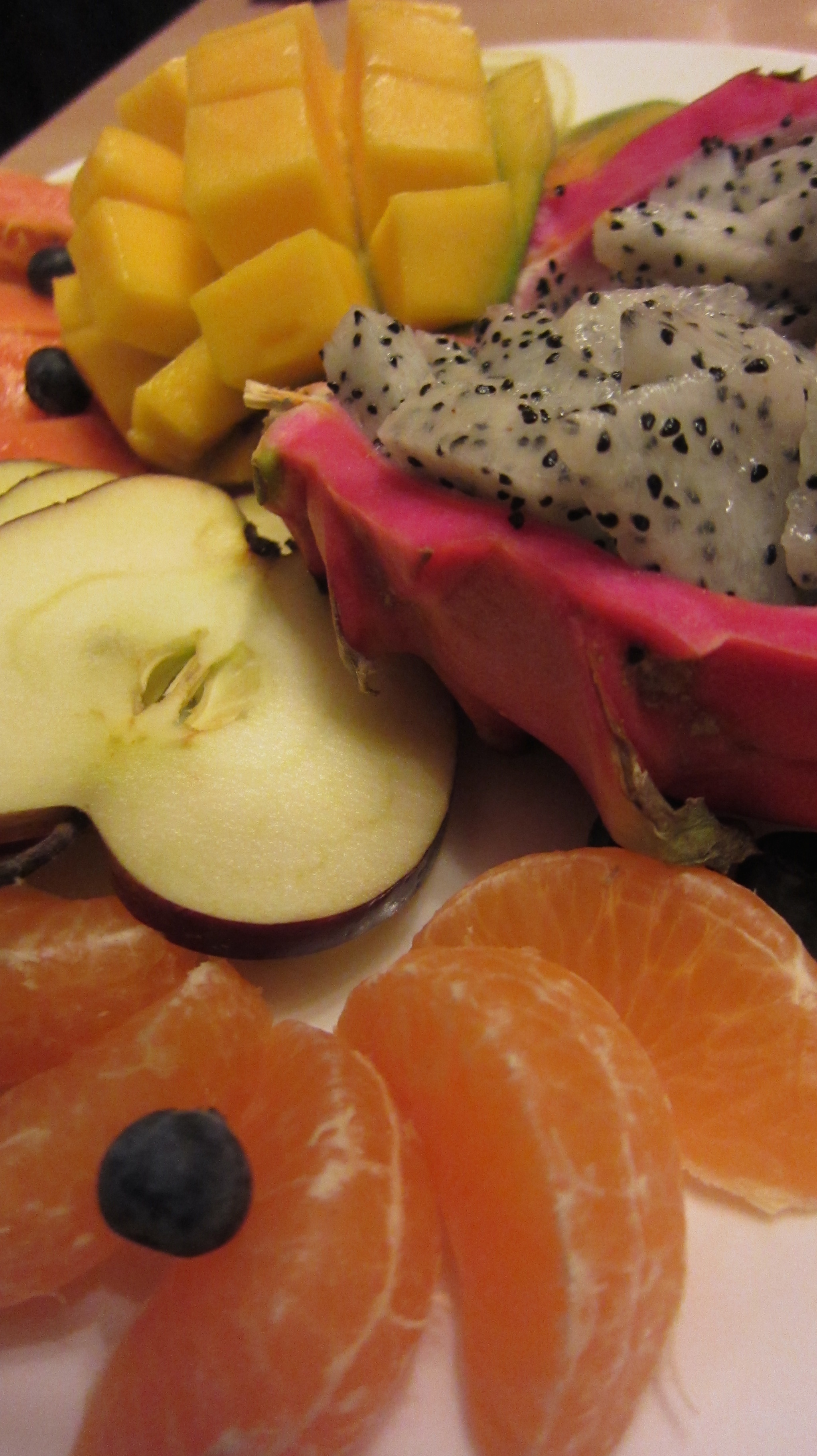 Zu den Thunfischfrikadellen gibt es bei unserem Spieleabend noch diesen leckeren Obstteller als süße Alternative. Auf dem Teller sind Heidelbeeren, Mangos, Pitahaya, Äpfel, Papayas und Mandarinen liebevoll von uns angerichtet.